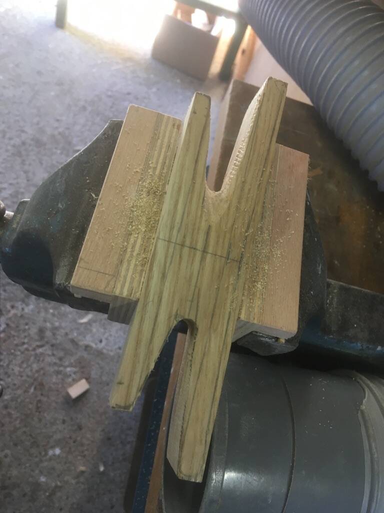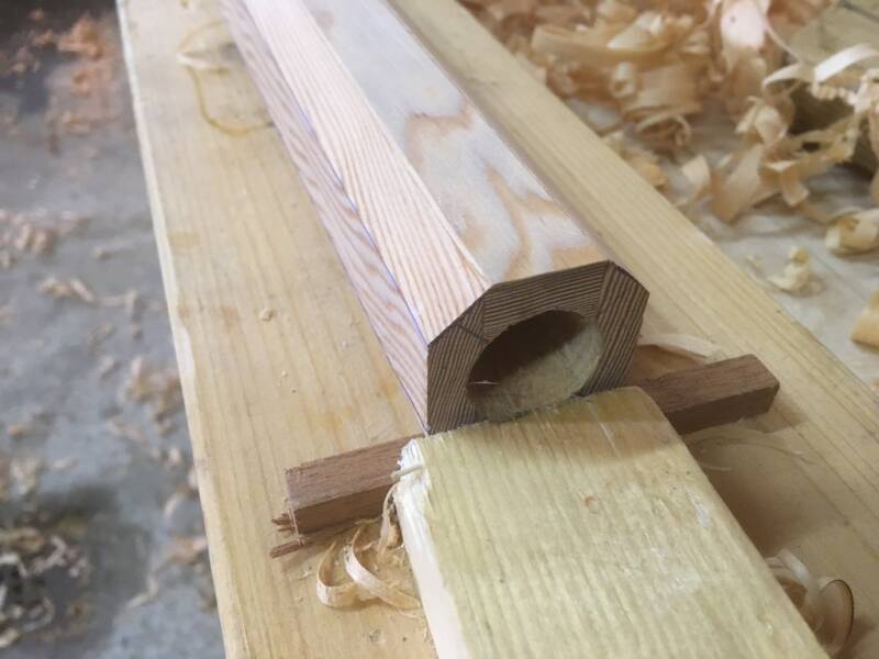 We made a spar gauge to plane the oar octagonally. Here we found that a ballpoint pen works better than a pencil.