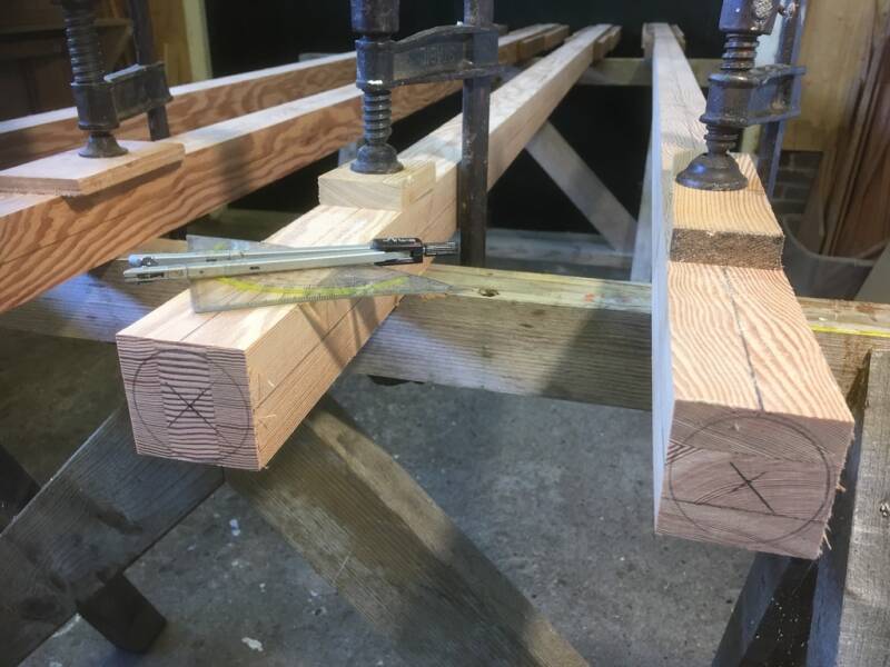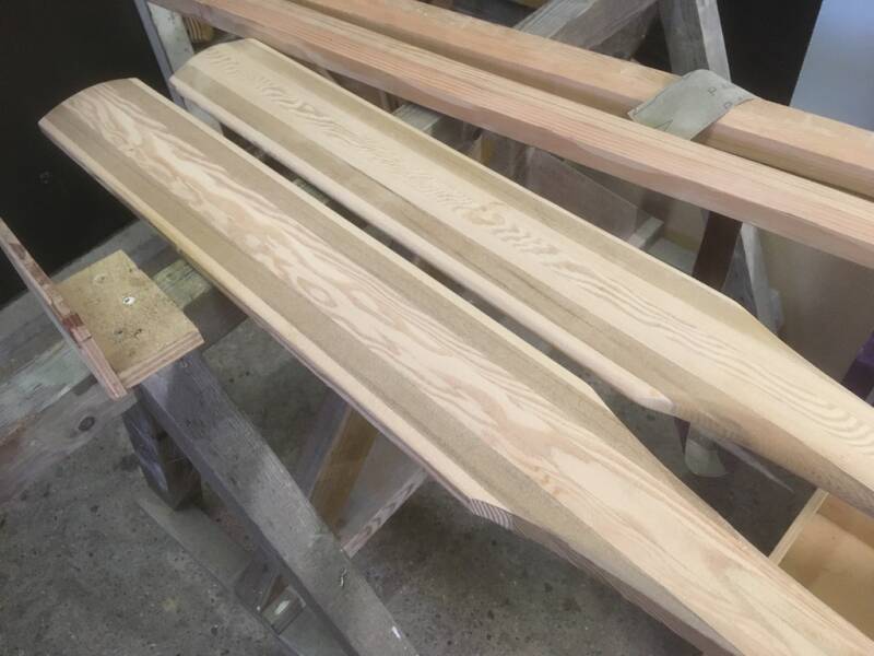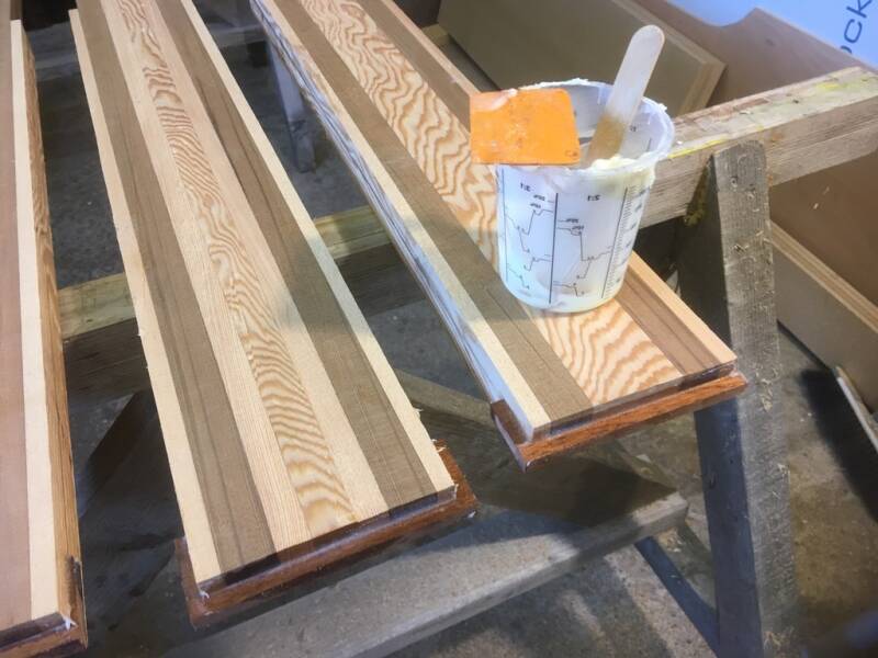 Gluing Red Cedar and Oregon slats onto the Oregon pine shafts