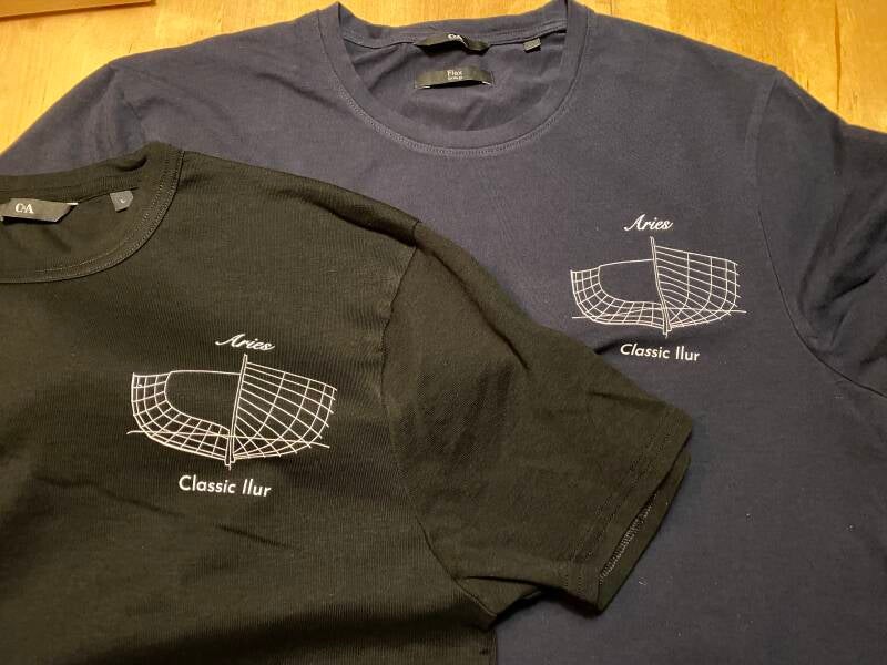 At school I made another gadget. T-shirts with a silk screen print of our boat plan and name. Just for fun.